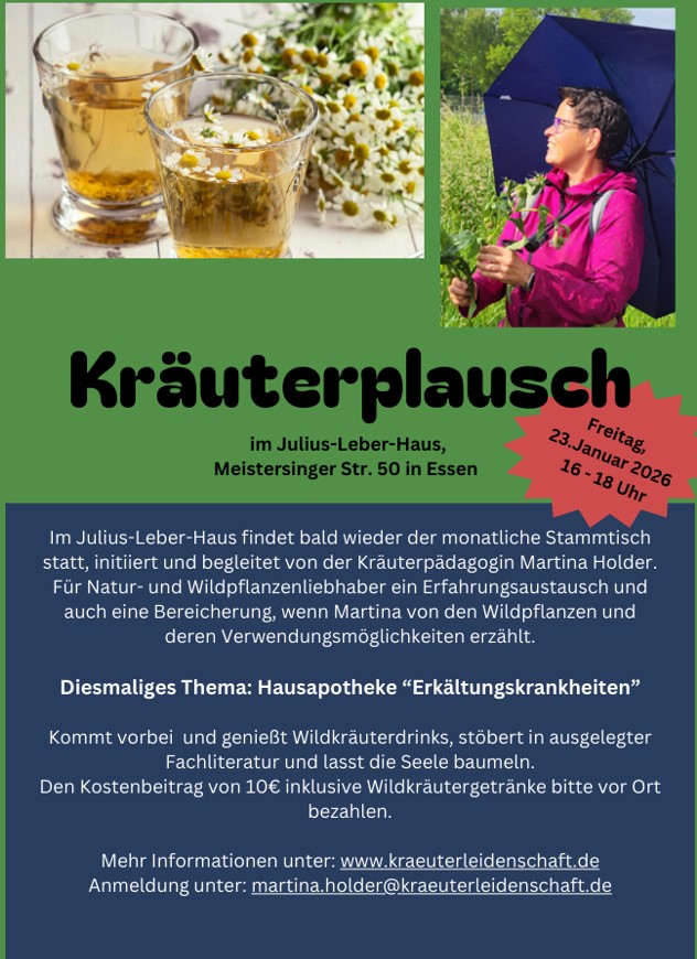 Am 09.05.2025 biete ich meinen nächsten Kräuterstammtisch an. Besonders die Wildpflanzen sind mir ans Herz gewachsen. Deshalb möchte ich mein Wissen mit Euch teilen und erklären was man in Essen und Umgebung heilkundlich sowie kulinarisch nutzen kann.